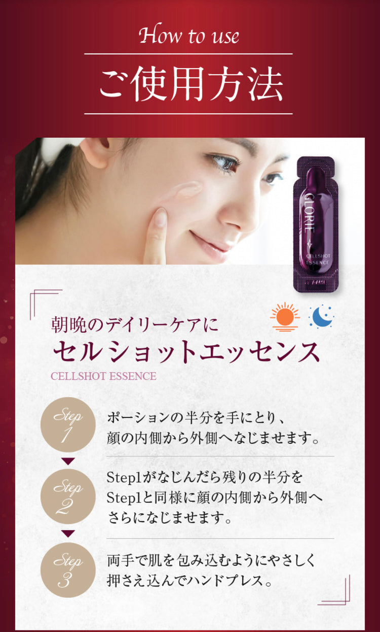 ①ポーションの半分を手に取り、顔の内側から外側へなじませます、
