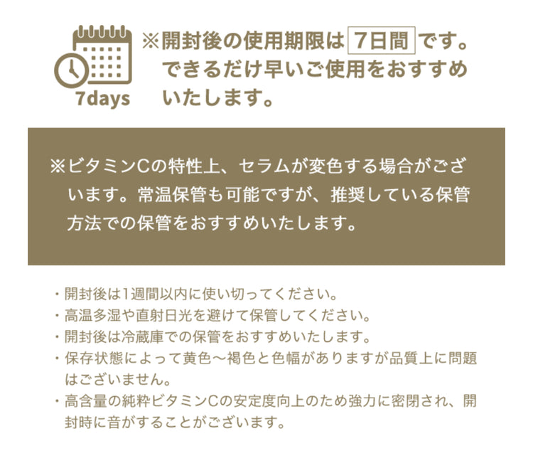 高含量のビタミンCの特性上、敏感肌の場合「製品適応期」やパッチテストをおススメします。