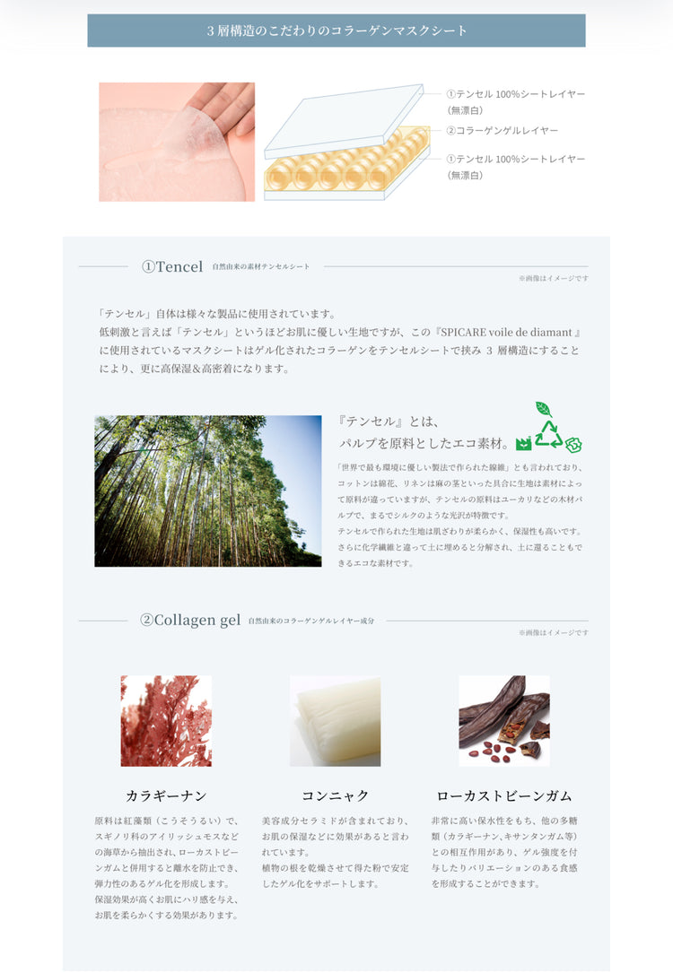 マスクシートはシルクのように柔らかな肌触りの高級テンセル素材にゲル化コラーゲンを挟んだ3層構造。