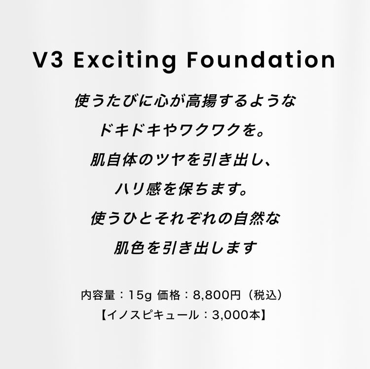 V3エキサイティングファンデーションはファンデーションを使用する時間をただのメイクアップや、ほこりや紫外線から肌を守る時間ではなく、画角的なスキンケアタイムへと変えていきます。